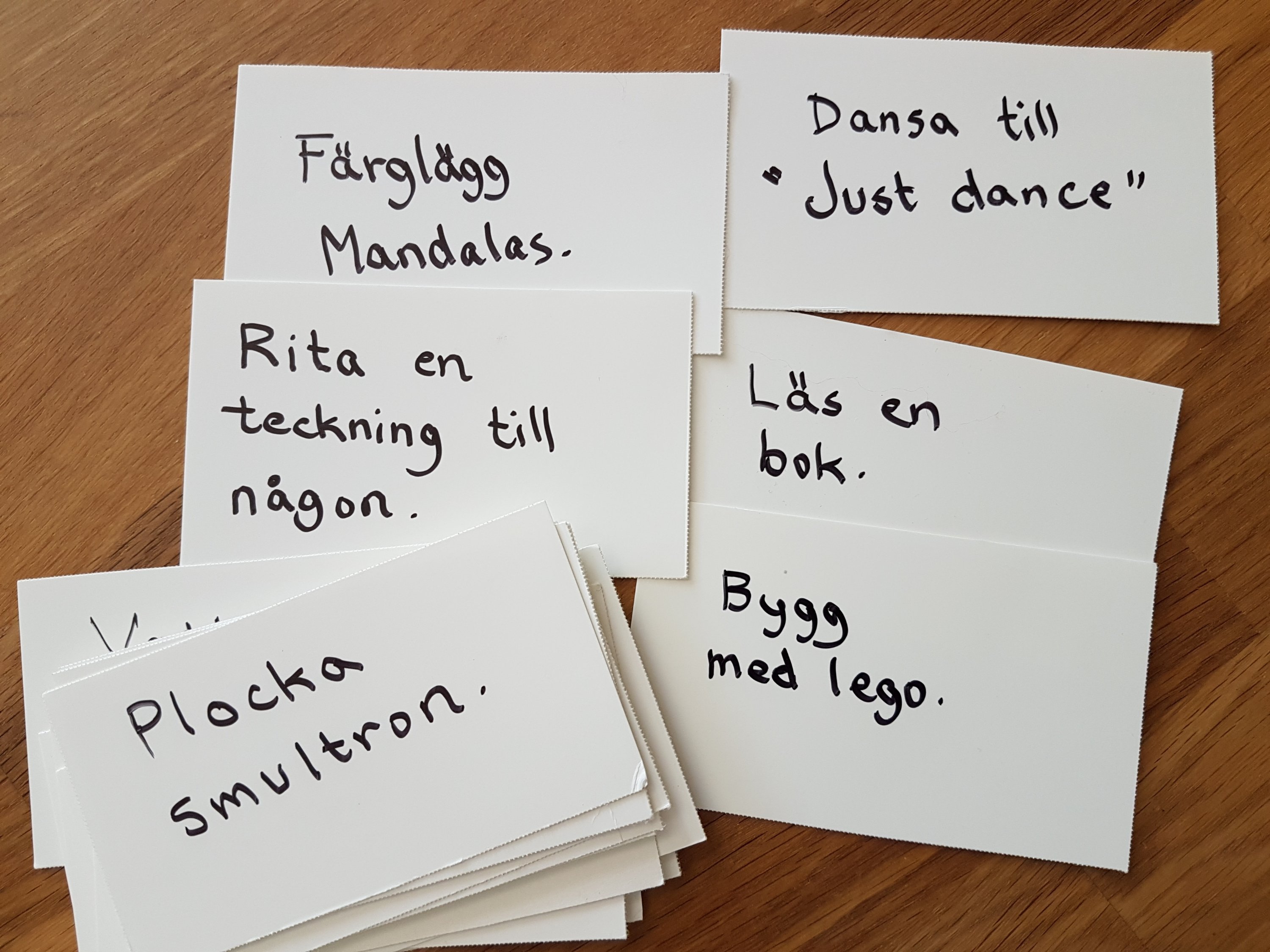 Jag har tidigare förberett kort för L att ta när det är tråkigt hemma. Det är det jag menar med ”Ta ett kort” på listan.