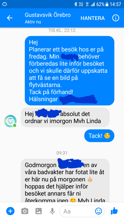 Innan vi åkte fick barnen titta på Youtube-klipp som visade de olika rutschkanorna och bassängerna. Vi skickade även ett meddelande till badet för att få en bild på hur låneflytvästarna ser ut. L (8 år) ville absolut veta det i förväg.